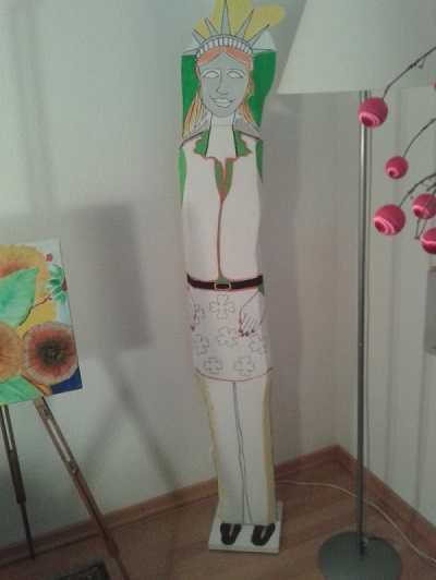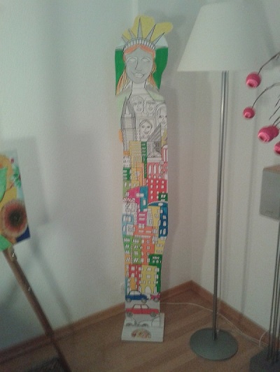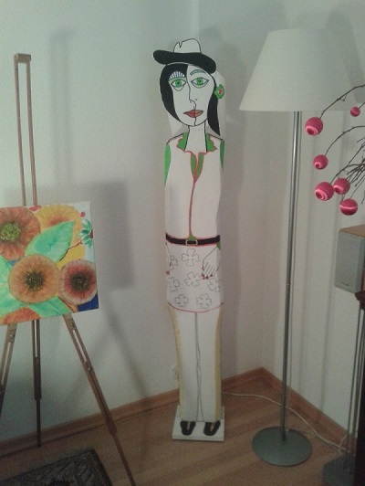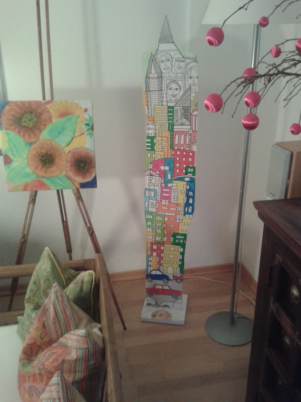 3 D - Holz In Form gebrachte Holzteile wurden mit Acrylfarben bemalt. Die Seiten werden unterschiedlich ausgeführt und teilweise drehend verbunden. So kann eine Skulptur verschiedene Wirkungen auf Raum und Betrachter erzeugen. Will man nach einiger Zeit das Designgefühl des Raumes ändern, dreht man Teile oder die ganze Figur |