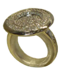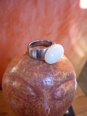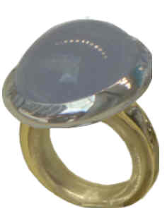 - Wechselring - Ein ovaler gefasster „Cabochon“, kann am Trägerring waagrecht, senkrecht oder/und drehbar angeschlossen werden. Neben der Möglichkeit, die Schmuckteile zu tauschen, verändert allein die Drehung des Schmuckkörpers um 90° das Erscheinungsbild des Ringes. |